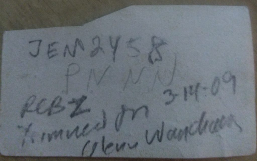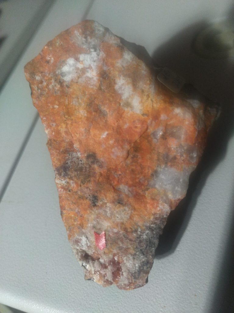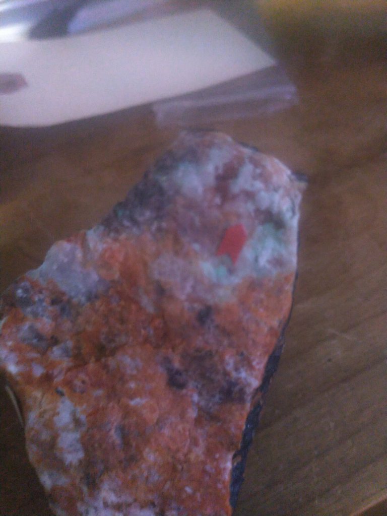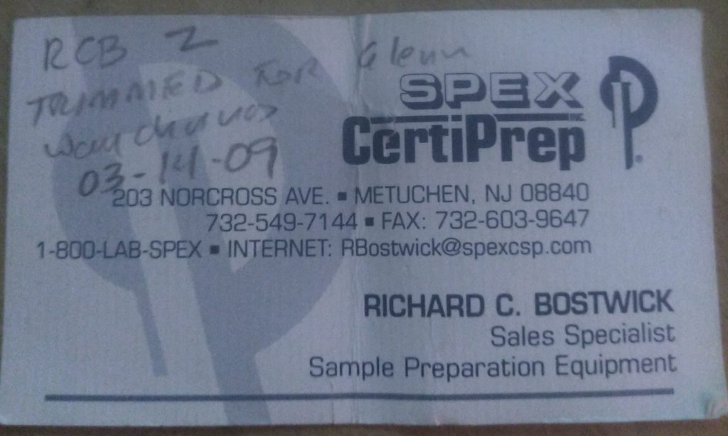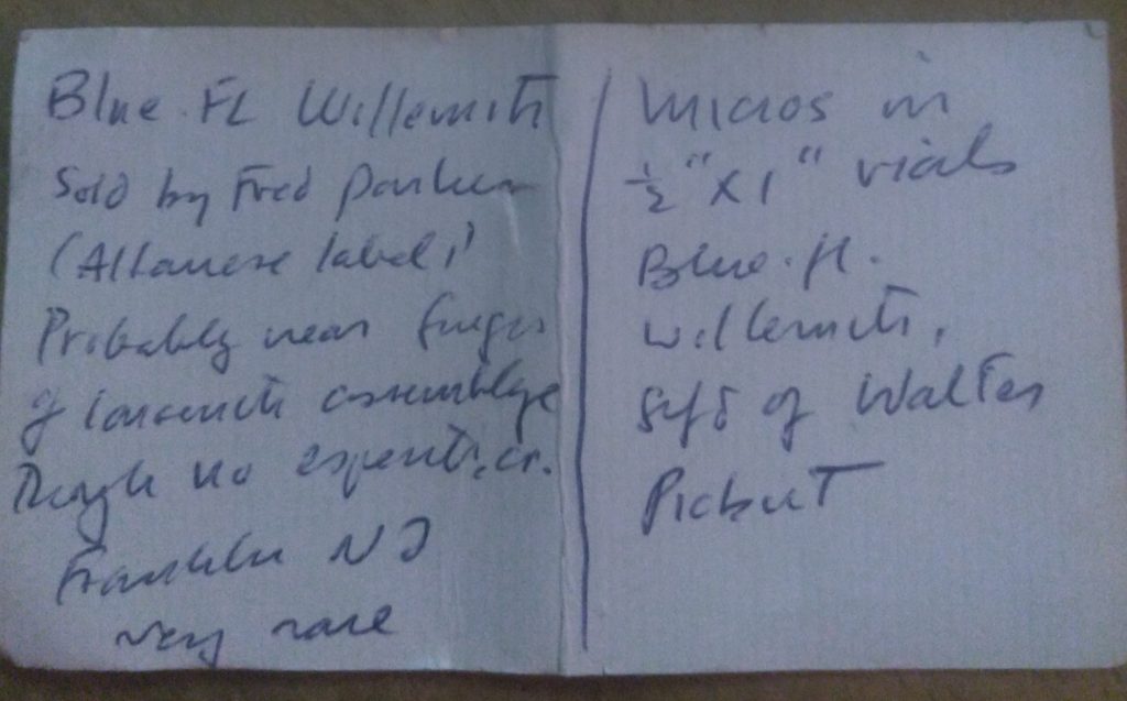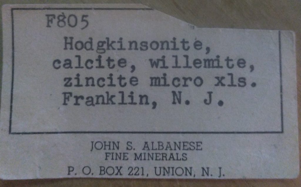 A rare special mineral came to the lab. This was a mineral held by both Albanese and then by Bostwick. It is a rare blue-fluorescing willemite! Hodgkinsonite and calcite are associated. A label remains: “JEM 2458”, and it was suspected to be of a “larsenite assemblage, but not esperite”. Notes indicate this came from Franklin. Under 254nm UV, the edge of this specimen gives a baby blue bright output, reminiscent of hydrozincite. But is this really a willemite? Let’s investigate!