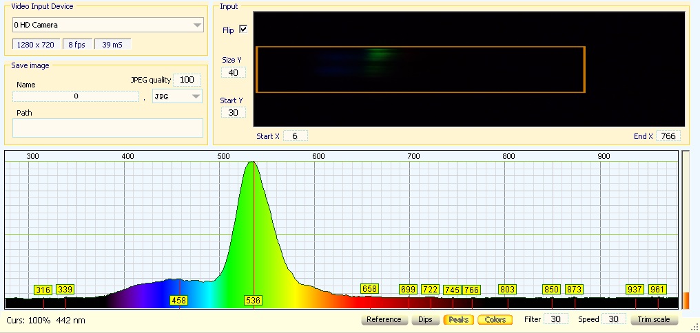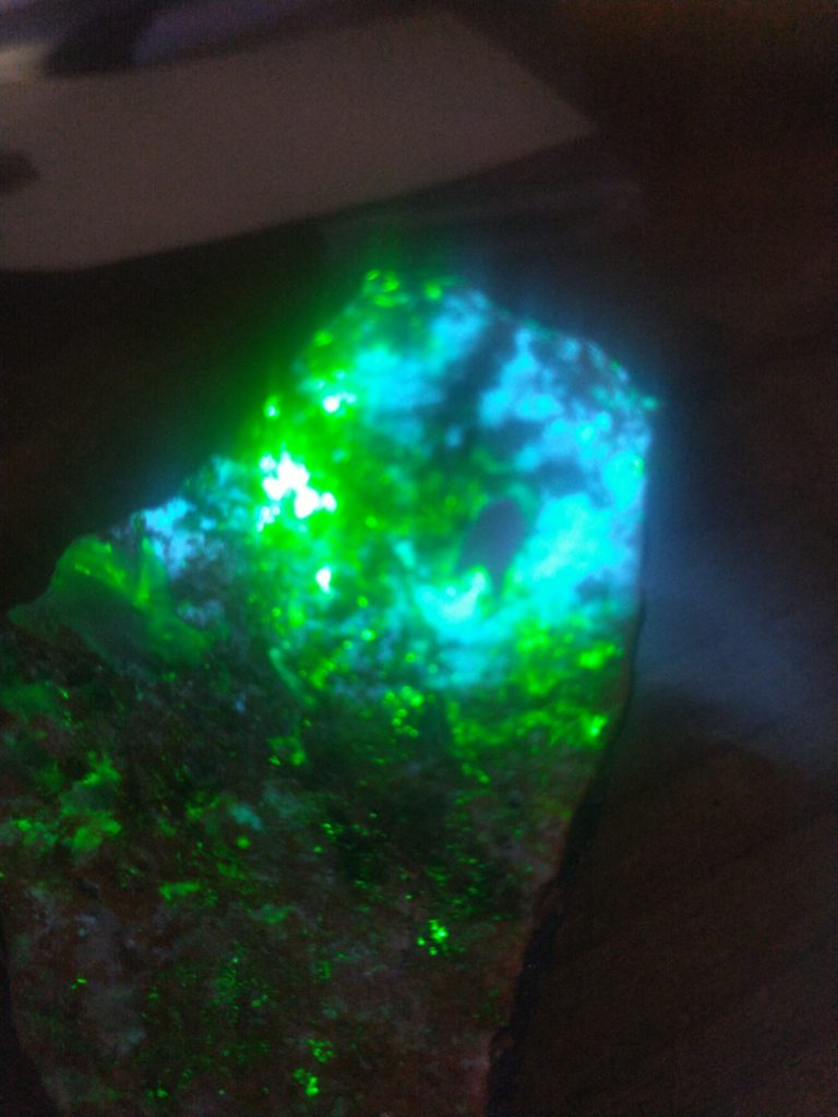 As seen under a Stimac 255nm flashlight and a Theremino – The blue shoulder and the willemite green peak are prominent.