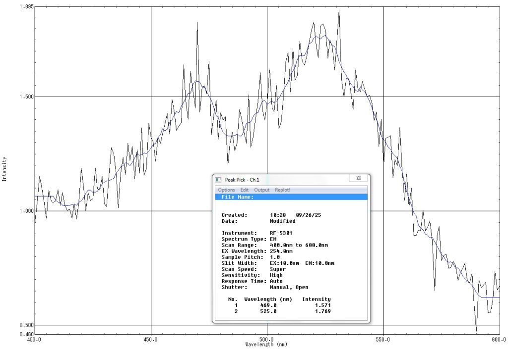 What we suspect is that there are two concurrent emissions at 254nm, resulting from lead (blue) and manganese (green). To confirm this, a fluorescence emission scan was performed at 254nm excitation (10mm slits and a 370nm order sort filter). Two relative maxima are seen: An unexpected 469nm and the usual 525nm line for a Franklin willemite.